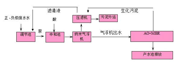 本系統針對該企業排放的廢水水質與水量。根據廢水的成分和特點,主要采用物化法,主要考慮懸浮物類及其他顆粒、微粒成分的去除,先把正極廢水與負極廢水混合,然后采用投加酸解的方式中和廢水后采用投加絮凝劑的方法使顆粒物及懸浮物形成絮體,結合所形成的絮體質輕的特點,采用納米氣浮機實現初步泥水分離,然后上層浮渣直接進行壓濾進行壓榨,濾清液回到原水收集槽,泥餅委外。
